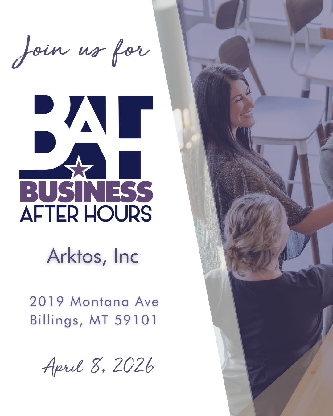 Join the Billings Chamber of Commerce with event host Arktos, on Wednesday, April 8, 2026, for Business After Hours! Stop in for drinks, appetizers, prizes, and networking! More about Business After Hours Business After Hours is the premier networking event for business professionals in the Billings area. It is held on the second Wednesday of each month from 5 - 7 p.m. and the cost to attend is $10 for members and $20 for nonmembers. This two hour time frame gives you the opportunity to discuss and share ideas while learning about and touring other local businesses. The regular event is a relationship-building experience held in a relaxed setting that benefits you and your company through added contacts and resources. Stay for 20 minutes or enjoy the full two hours of networking time. Get out there! Give people the chance to get to know you so they will want to do business with you. Admission includes two complimentary drink tickets, hors doeuvres and great conversations! Don't forget your business cards! REMINDER: If you are a Trailhead, Rimrock, Beartooth, Granite Peak, or Big Sky chamber member, you may already have tickets which means you do NOT need to register before Business After Hours. Reach out to Cathy at Cathy@BillingsChamber.com if you have any questions!