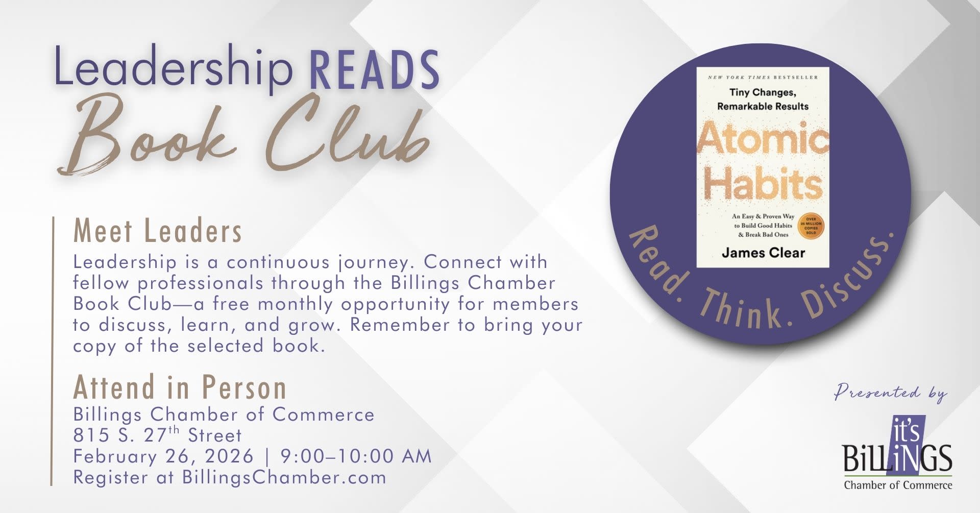 The Billings Chamber Leadership Reads Book Club is a new opportunity for members to grow together through meaningful conversations rooted in leadership, learning, and personal development. Each month, we’ll explore a different book that offers practical insights, fresh perspectives, and ideas you can apply in your work and daily life. This monthly gathering is designed to spark discussion, strengthen professional connections, and support your leadership journey—one chapter at a time. February 2026 February’s Leadership Reads will feature Atomic Habits, a powerful guide to building better habits and breaking the ones that hold us back. This session will explore how small, consistent changes compound over time to create meaningful personal and professional growth. Participants can expect a thoughtful, facilitated discussion focused on practical strategies to improve performance, strengthen leadership, and create lasting results in the workplace and beyond. When We Meet The Book Club meets once a month, with sessions held from 9:00–10:00 AM. Dates and locations will be shared in advance of each discussion. Cost & Materials Attendance is free for Chamber members. Participants will need to bring their own copy of the monthly book selection. Whether you're looking to sharpen your leadership skills, connect with fellow professionals, or simply enjoy great discussions, this is a welcoming place to start.